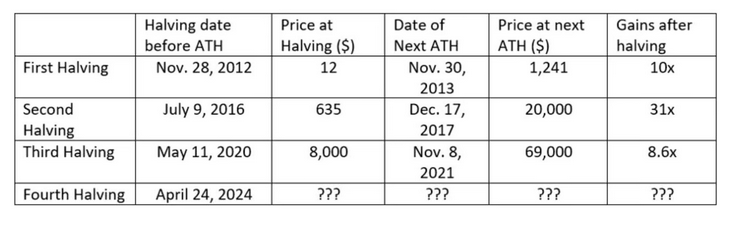 Dopo circa un anno e mezzo i precedenti Halving, i massimi di BTC hanno superato rispettivamente di 10 volte, 31 volte e 8,6 volte il prezzo che BTC aveva al momento dell’Halving.