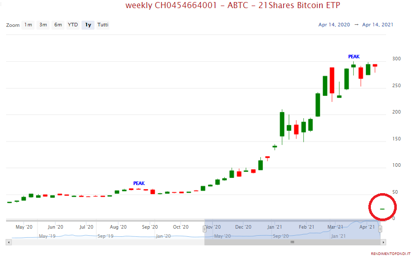A dicembre 2020 vi abbiamo parlato del 21Shares Bitcoin ETP, un ETP che era riuscito a rendere facilmente disponibile un’investimento nella criptovaluta più famosa al mondo, senza passare per procedimenti complessi come la blockchain. Da quel momento il grafico non ha fatto altro che salire, seguendo fedelmente l’andamento del Bitcoin: se il 4 dicembre 2020 chiudeva a 95 dollari per quota, il 12 aprile è arrivato a superare i 290 dollari per quota, più che triplicando il suo valore.
