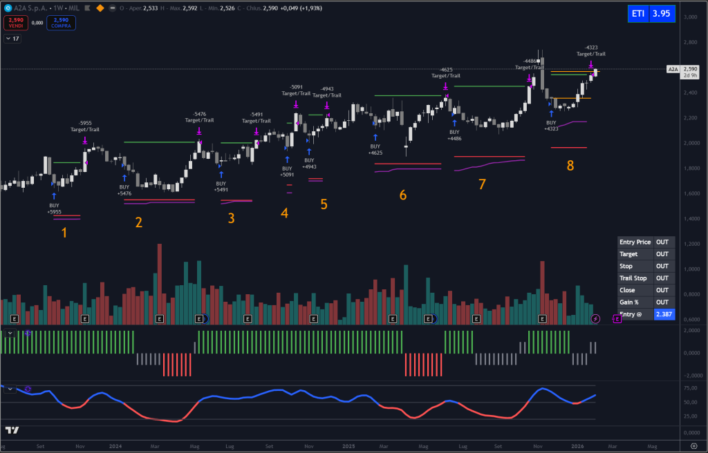 Il grafico mostra una sequenza ordinata di ben 6 ingressi e target raggiunti di fila.