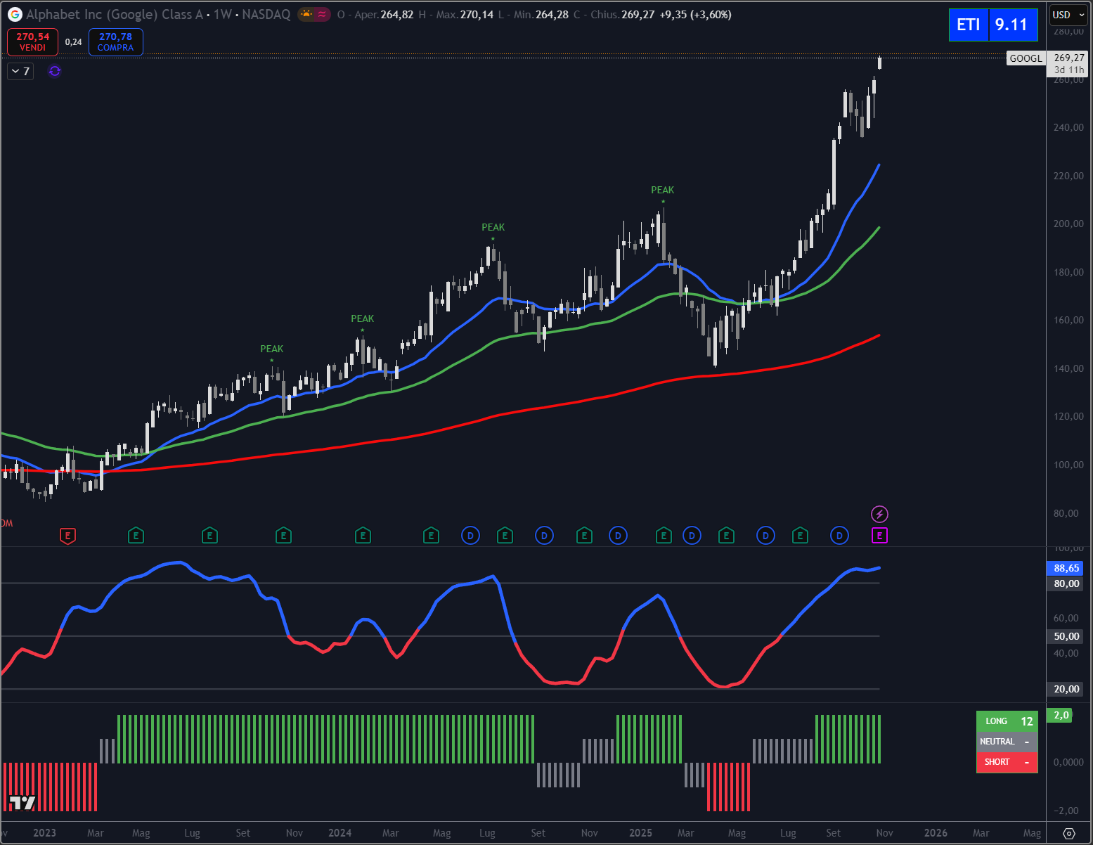 L’ETI a 9,11 conferma la forza del trend, mentre il Trendycator resta saldo in fase long, coerente con un momentum di mercato che continua a favorire i titoli tech a grande capitalizzazione.