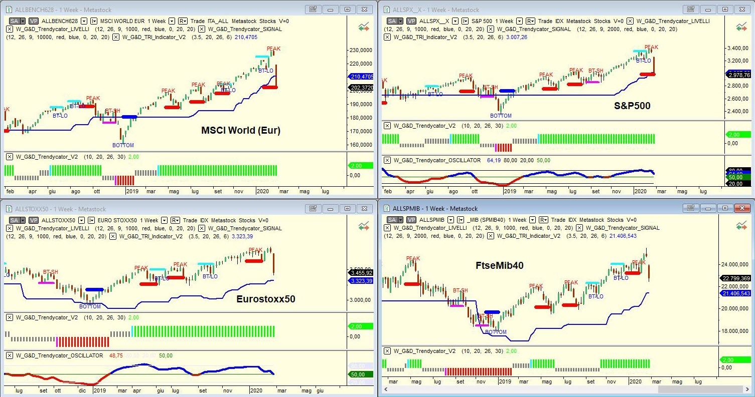 Imbarcata consistente delle Borse internazionali, ora che il virus non è più solo diffuso in Cina, ma ha fatto la sua dirompente comparsa – seppur a macchia di leopardo – in gran parte del globo. Brutta battuta d’arresto quindi, dopo un lungo periodo di sostanziale tranquillità e mercati intonati decisamente al rialzo. Rialzo che ora, seppur non ancora compromesso del tutto, ha perso molto del suo smalto e della sua forza. Il modello Trendycator risulta ancora verde su tutte le Borse analizzate, ma senza una reazione dei mercati la situazione potrebbe cambiare rapidamente, sancendo ufficialmente quantomeno una pausa al rialzo.