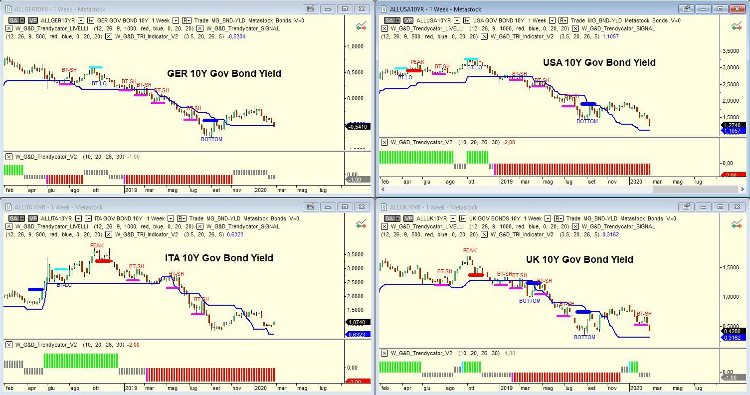Per ora rimane NEUTRAL l’impostazione sul decennale tedesco con il modello Trendycator che sul Bund è ancora grigio, ma il crollo dei rendimenti potrebbe far cambiare la situazione che è in divenire. Rendimenti quindi ora ben sotto area -0,50% che non si vedevano da ottobre 2019.