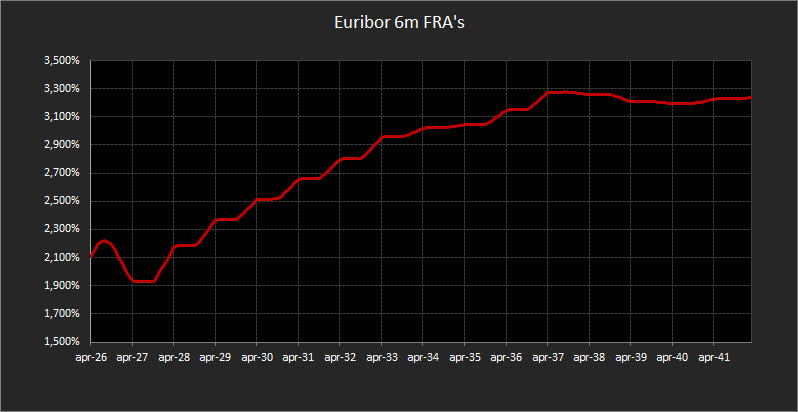 Sul fronte monetario, i forward Euribor 6 mesi mantengono un quadro di sostanziale stabilità: le proiezioni per il 2026 restano in area 2,20%, quelle per il 2027 intorno all’1,90%, mentre oltre tale orizzonte si prospetta una progressiva risalita sopra il 3%.