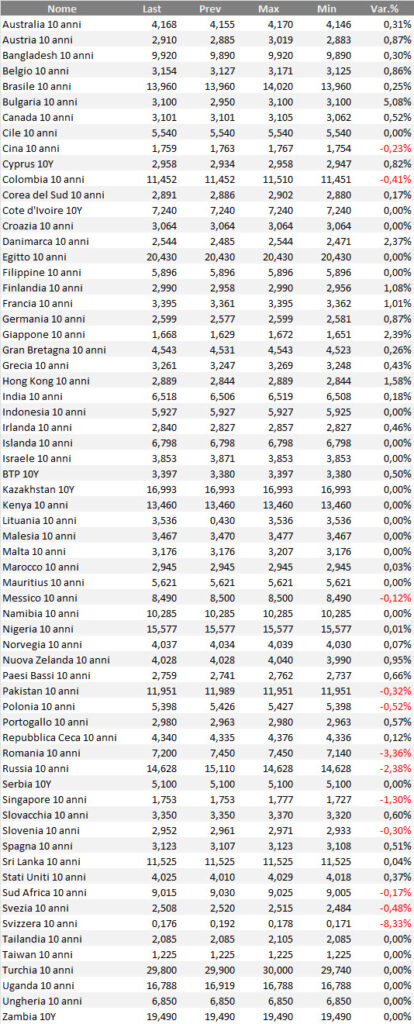 Tabella dei rendimenti, su base settimanale, delle obbligazioni governative mondiali con qualunque rating. Il ranking considera i bond benchmark decennali in tutte le valute di emissione. In alcuni casi, per alcuni emittenti o per alcune valute, il rapporto rischio/rendimento di questi bond può essere anche piuttosto speculativo.
