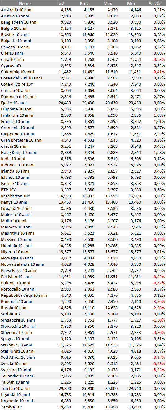 Rendimenti bond governativi benchmark mondiali