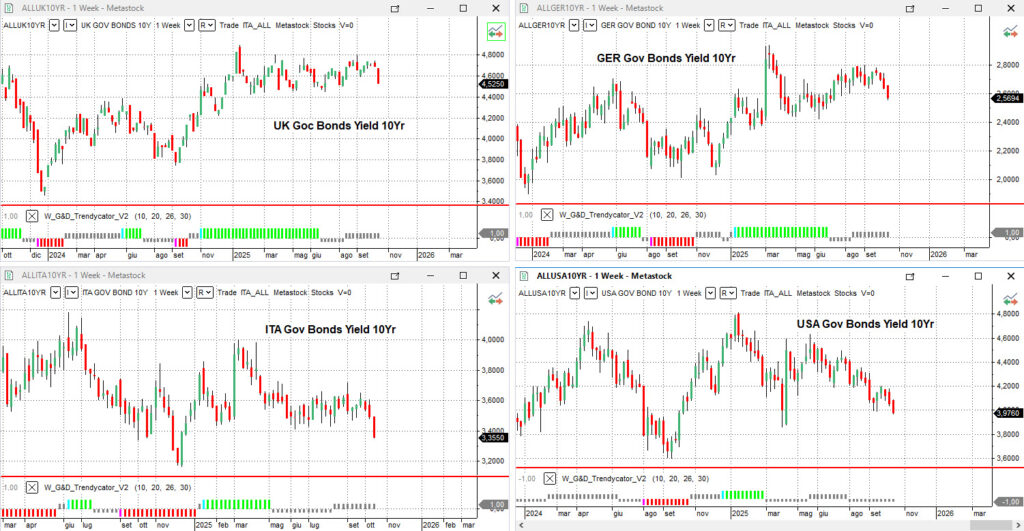 Il panorama dei mercati obbligazionari internazionali sembra mostrare l’avvio di una nuova fase, con variazioni al momento ancora limitate nei rendimenti in un quadro tecnico che continua a riflettere consolidamento piuttosto che direzionalità. Il Trendycator, infatti, resta NEUTRAL su tutte le principali aree, segnalando l’assenza di impulsi strutturali sia rialzisti sia ribassisti nel breve termine, ma le dinamiche dei rendimenti iniziano a suggerire possibili cambiamenti.