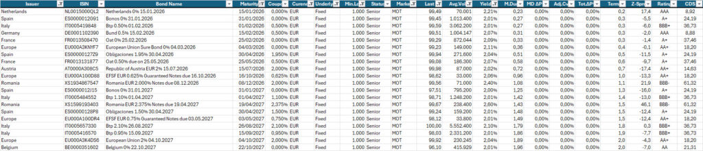 Selezione di governativi e sovranazionali area euro con scadenza entro il 2027, prezzo sotto 100, altissima liquidità e rendimento a scadenza almeno pari al 2% lordo annuo.