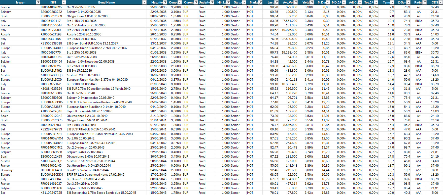 Selezione di governativi e sovranazionali area euro con scadenze dal 2035 al 2045, prezzo sotto 100, buona liquidità e rendimento a scadenza almeno pari al 3% lordo annuo.