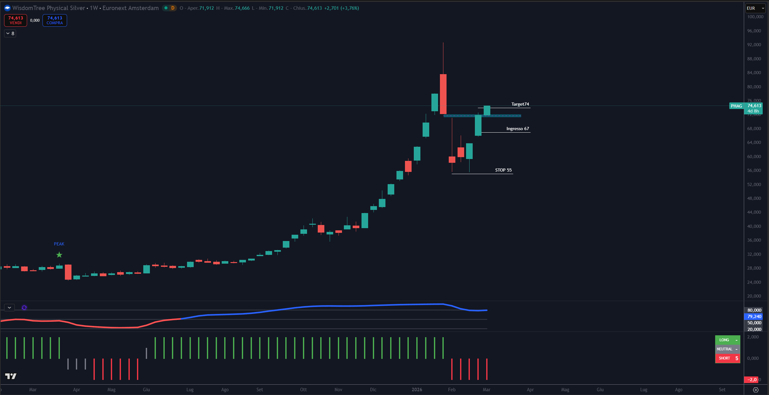 Entrare a questi livelli implica una probabilità sostanzialmente simmetrica di successo o insuccesso. Per questo motivo oggi non inserisco l’ETC in portafoglio.
