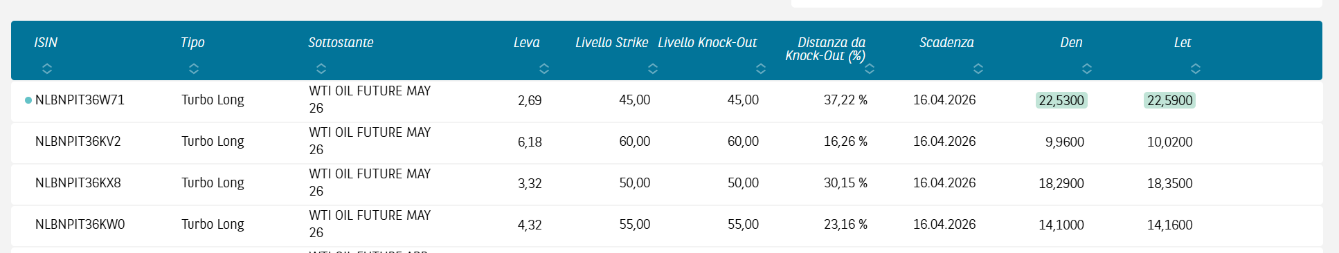 Tra i Turbo BNP su WTI segnalo il NLBNPIT36KW0.