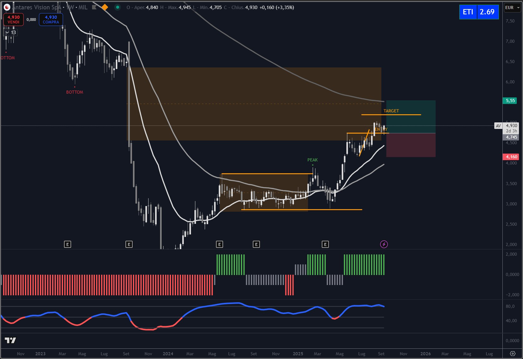 Dopo la fase di accumulazione tra la seconda metà del 2023 e i primi mesi del 2024, il titolo ha completato una solida base laterale rompendo al rialzo l’area di congestione. Il superamento del massimo relativo (segnalato come peak sul grafico) ha innescato un movimento direzionale che ha portato i prezzi a consolidare nella fascia 4,70–5,00 euro.