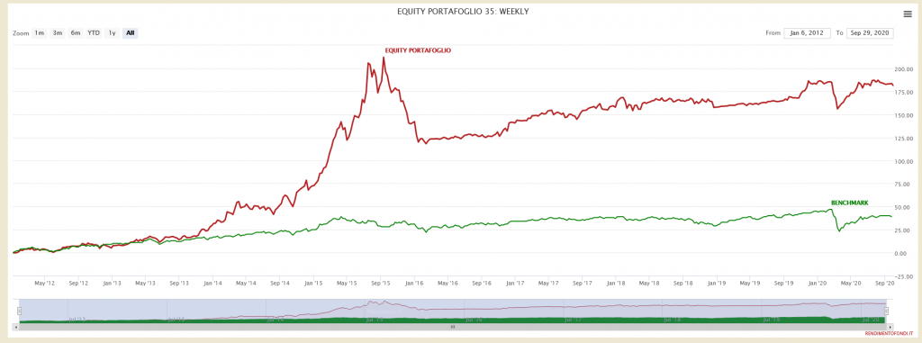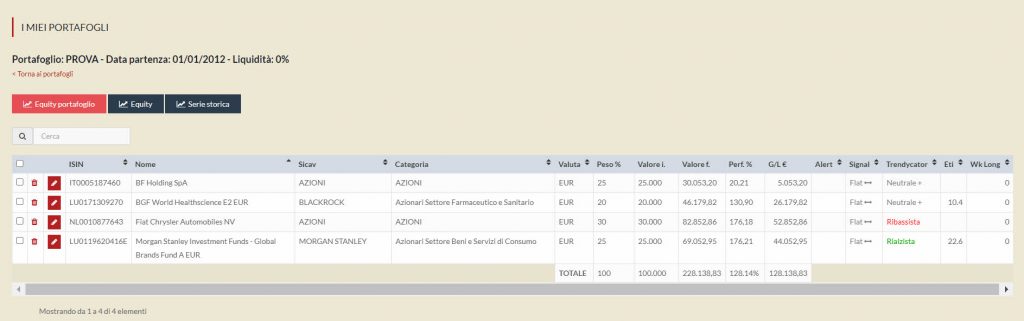 Entrando nel dettaglio del portafoglio il lettore ha la possibilità di modificarne a suo piacimento la composizione, valutarne le performance e visualizzare diversi grafici: equity di portafoglio, equity singola, serie storica dei titoli selezionati.