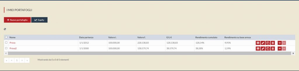 La prima sezione serve a creare e modificare i portafogli, nonché anche a tenerne monitorate le performance con una visione d’insieme di tutti i portafogli. In questa pagina, senza entrare nel dettaglio del portafoglio, è possibile visualizzare la equity di portafoglio e selezionare due portafogli per poterli confrontare graficamente.