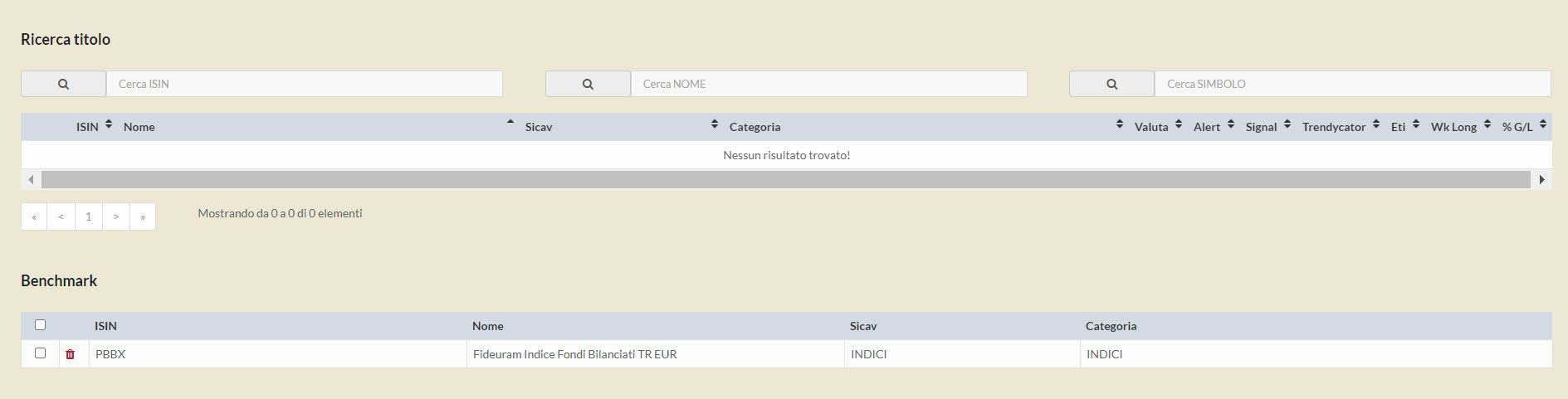 Nella medesima pagina sarà possibile ricercare qualunque strumento presente nel database di CircoloInvestitori e decidere poi se inserirlo nel portafoglio, assegnando ad esso un peso opportuno, o se inserirlo come benchmark.