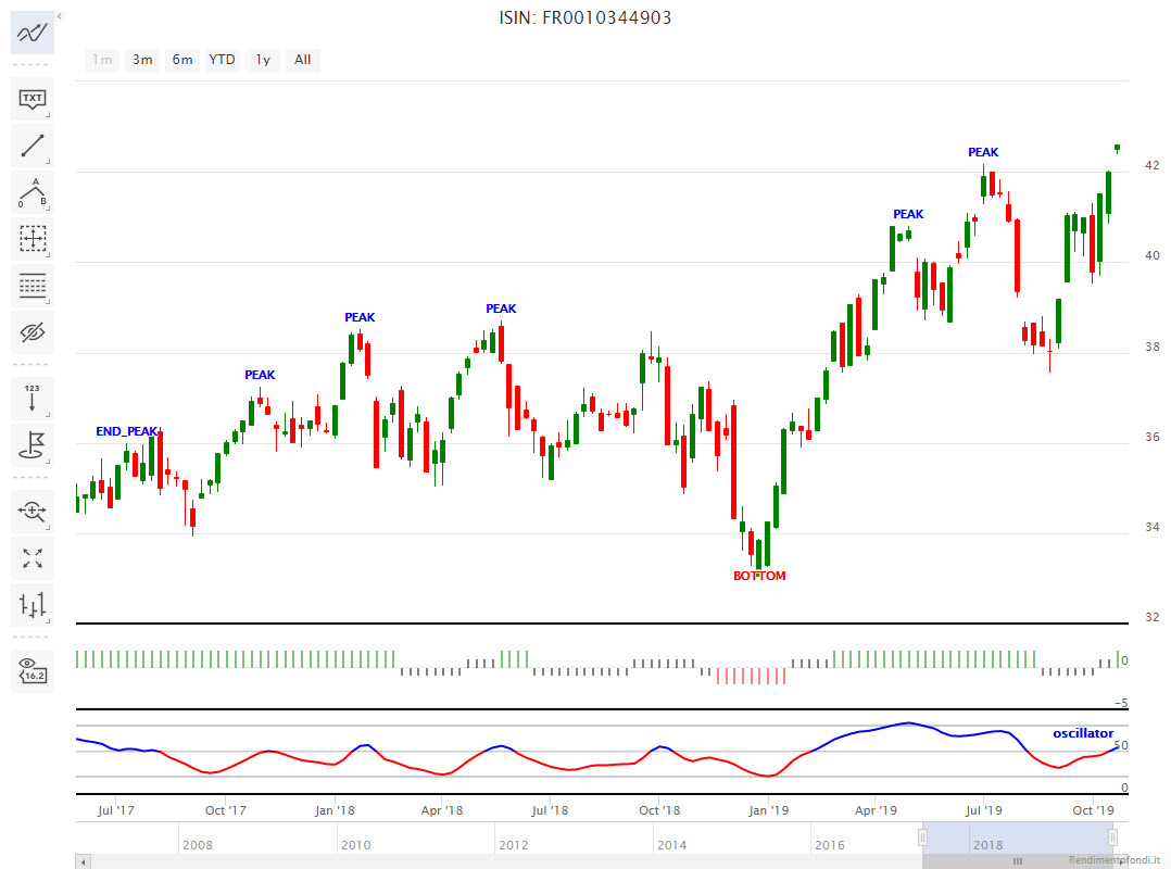 La conformazione grafica dell’ETF Lyxor Ucits Etf Stx 600 Insurance LU1834987973 è molto interessante, poiché Trendycator ci segnala un potenziale buy nascente. Come si vede dal grafico, la settimana in corso sta facendo registrare una barra rialzista con un gap di fuga che ha portato le quotazioni sopra il massimo relativo precedente a 42,17 – che tra l’altro era anche un PEAK – e ora sta provando ad allungare oltre.