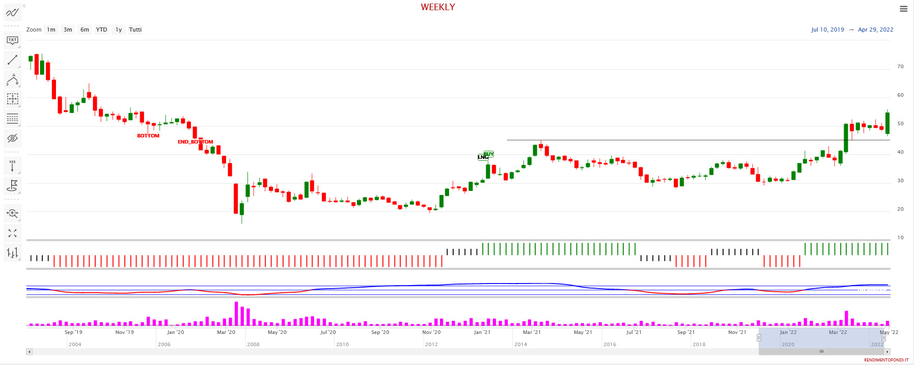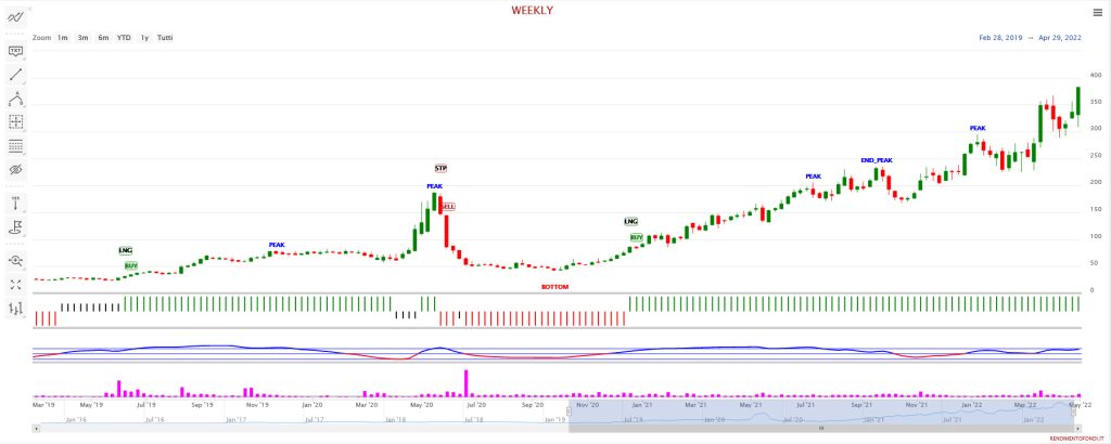 Va certamente sottolineato il BUY di Trendycator nel 2021 che oggi ha già un utile vicino al +50%, ma l’aspetto che rende ancor più interessante questa azione è data dai due recenti strappi verso l’alto che hanno portato i prezzi a superare la congestione laterale in atto proprio dal 2021.