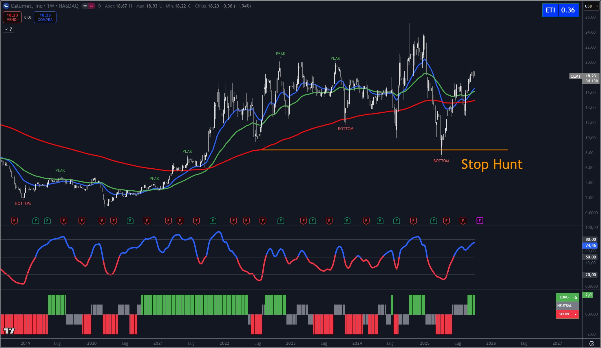 Il grafico settimanale di Calumet, Inc. (ticker CLMT, ISIN US1314761032) mostra una struttura caratterizzata da ampia volatilità e movimenti laterali estesi. Dopo la fase di correzione profonda del 2024, il titolo ha reagito con decisione dal minimo in area 8 USD, configurando uno Stop Hunt seguito da un recupero tecnico sostenuto.