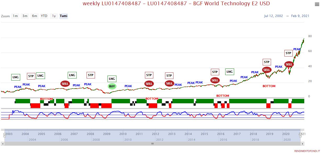 Analizziamo ora l’andamento storico del BGF World Technology E2 – LU147408487 attraverso i grafici del Trendycator. Come facilmente intuibile dall’immagine qui sotto, il fondo non ha esordito nel migliore dei modi, vivendo una fase laterale iniziale piuttosto lunga, alternando brevi periodi di crescita ad altri di stallo.