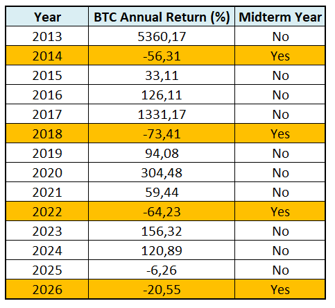 Negli anni di midterm USA, Bitcoin ha finora chiuso sempre in negativo nei dati disponibili. La fase successiva ha invece mostrato una maggiore forza. Il fenomeno è coerente con dinamiche di incertezza e successivo riassorbimento, ma resta una semplice regolarità osservata, non una legge di mercato.