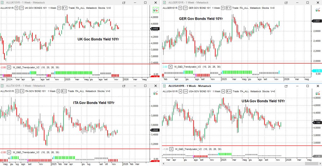In Germania, il Bund decennale sale al 2,80%, un incremento che interrompe la stabilità che aveva caratterizzato le rilevazioni precedenti. Trendycator vira su LONG sui rendimenti, suggerendo un contesto in cui la pressione al rialzo potrebbe mantenersi più visibile. È una configurazione che riflette il nuovo clima europeo: il taglio dell’outlook sui bond UE e la crescente percezione di rischio stanno ridisegnando il profilo della curva tedesca, tradizionalmente vista come barometro della solidità continentale.