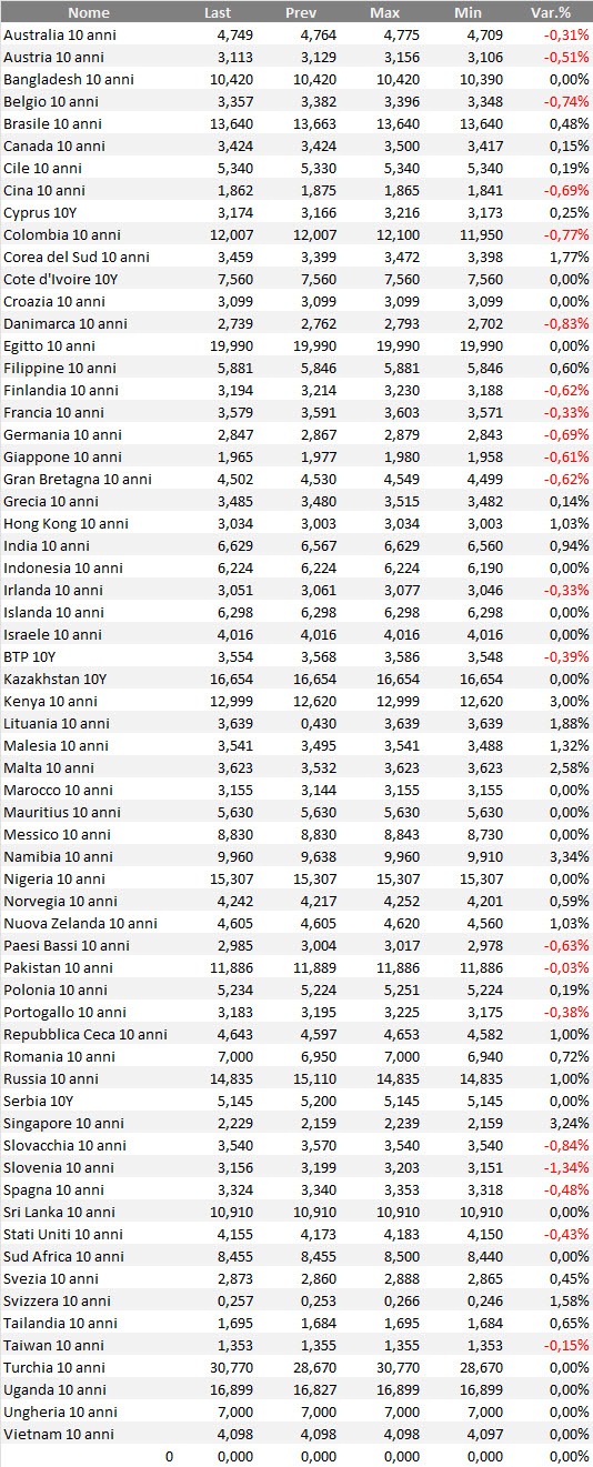 Rendimenti bond governativi benchmark mondiali