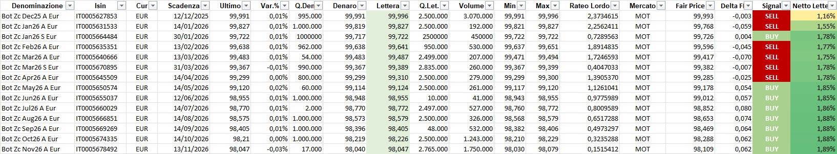 Focus sui BOT, con evidenza dei più interessanti poiché sottovalutati in termini relativi in rapporto al prezzo teorico.