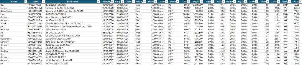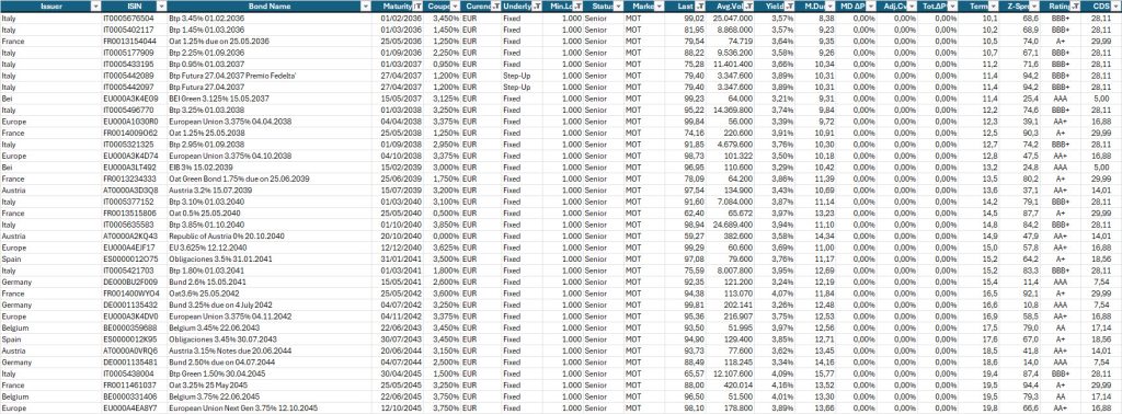Sul tratto intermedio e lungo, l’impostazione rimane selettiva. Rendimenti in area 3,20%–3,25% sulle scadenze 2038–2045 continuano a rappresentare il baricentro del portafoglio, perché offrono una remunerazione coerente con il quadro macroeconomico e un profilo di rischio gestibile.