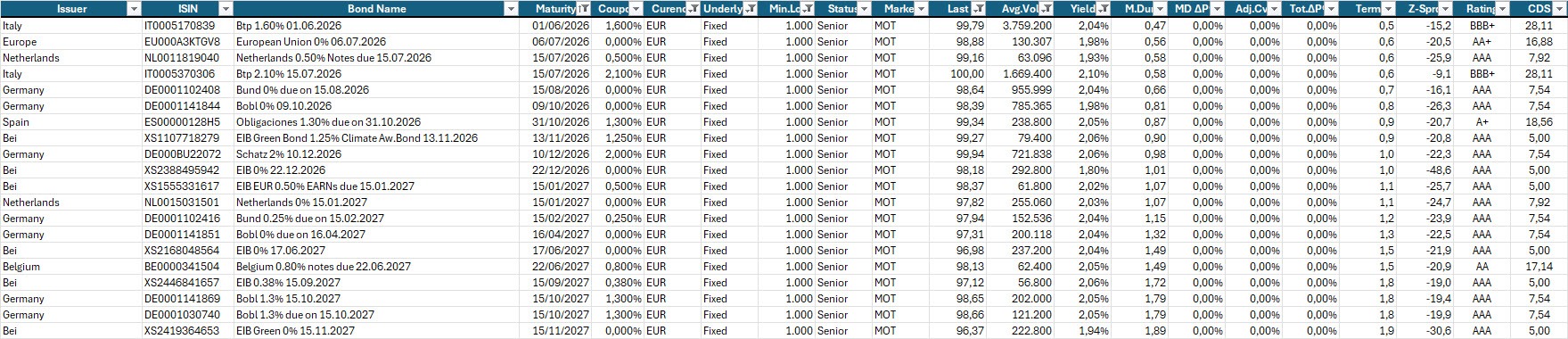 Selezione di governativi e sovranazionali area euro con scadenza entro il 2028, buona liquidità, prezzo sotto 100 e rendimento a scadenza almeno pari al 2,10% lordo annuo.