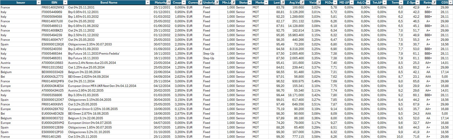 Selezione di governativi e sovranazionali area euro con scadenze dal 2030 al 2035, prezzo sotto 100, buona liquidità e rendimento a scadenza almeno pari al 3,00% lordo annuo.