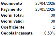Al decrescere del numero di giorni “validi” il fattore moltiplicativo scende sotto 1, per cui se avessimo ad esempio solo 10 giorni validi su 30 otterremmo: 10/30 = 0,33, pe cui 0,5% x 0,33 = 0,17%.