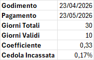 Immaginiamo due scenari per la prima cedola in pagamento, prevista per il 23 maggio prossimo. I giorni effettivi per il calcolo della cedola sono 30. Se per tutti i 30 giorni il rendimento del BTP decennale rimarrà tra lo 0% e il 5%, il rapporto sarà 30/30 ovvero 1, per cui 0,5% x 1 = 0,5%.