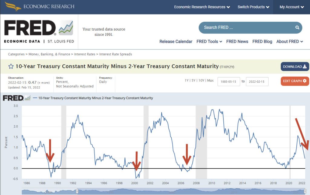 Come vedi, ogni volta che nel passato si è verificata la famigerata inversione della curva dei tassi, dopo poco è arrivata puntuale una recessione economica.