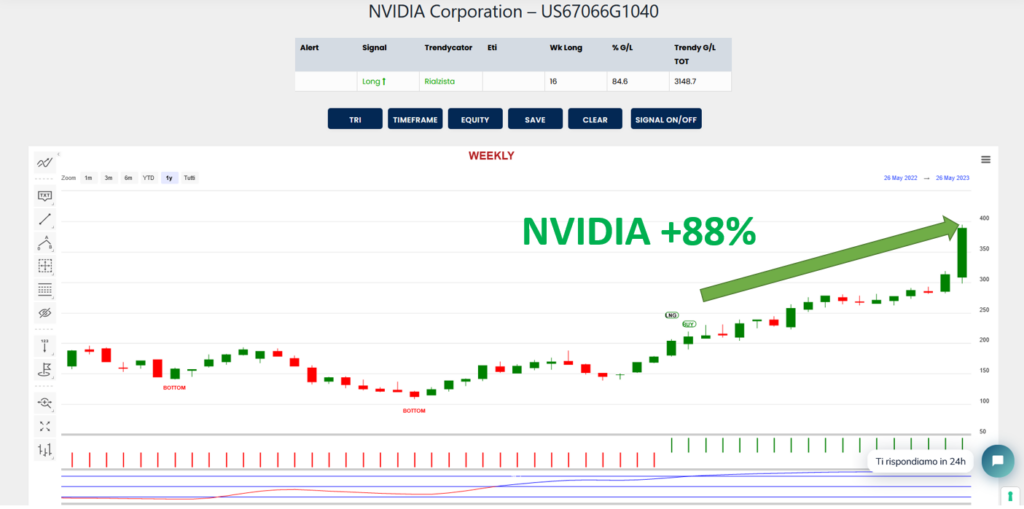Fra le azioni del nostro Trading System USA, ovviamente, non possiamo non citare NVIDIA che vanta ad oggi una performance del +88%.