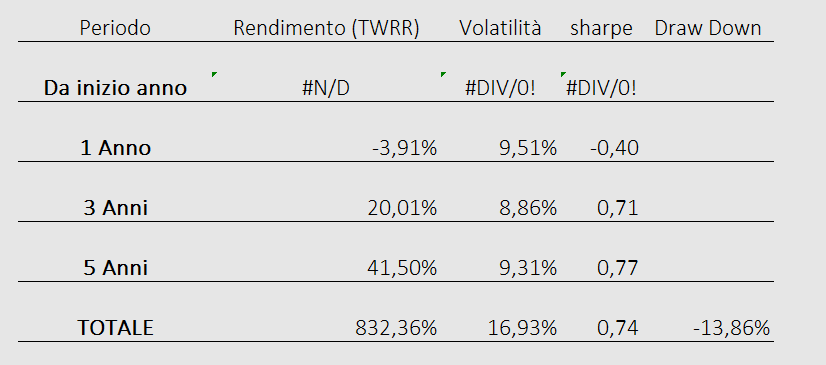 NB: il grafico della equity line (curva dei profitti) non è generato automaticamente da un trading system ma viene elaborato da un software professionale di portafoglio alimentato manualmente dall’inizio della serie e tiene conto di eventuali cedole percepite e ribilanciamenti avvenuti negli anni.