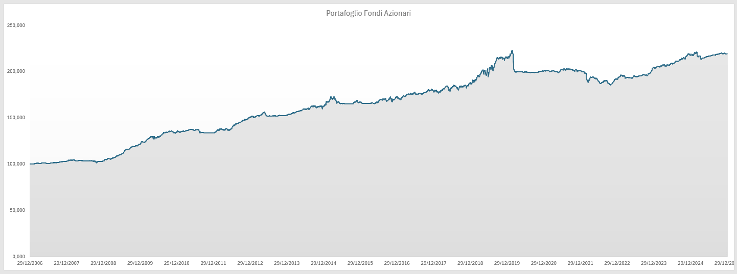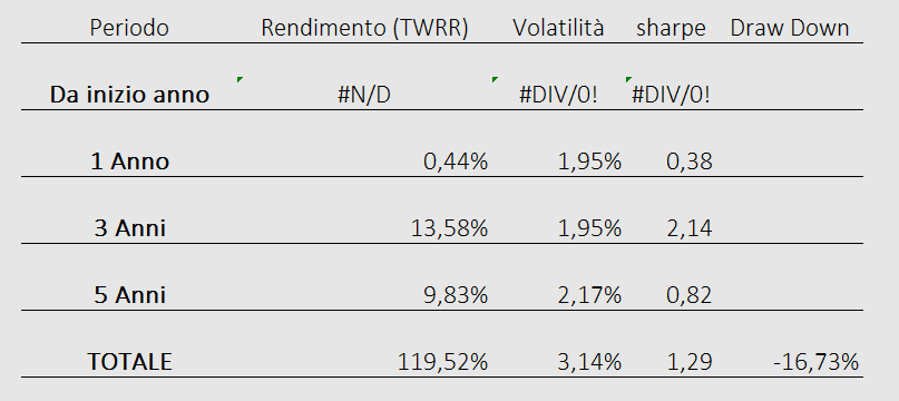 NB: il grafico della equity line (curva dei profitti) non è generato automaticamente da un trading system ma viene elaborato da un software professionale di portafoglio alimentato manualmente dall’inizio della serie storica e tiene conto di eventuali cedole percepite e ribilanciamenti avvenuti negli anni.