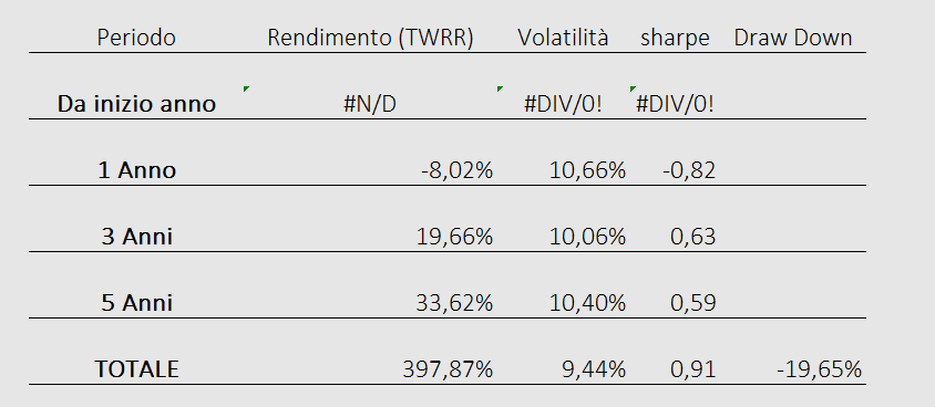 NB: il grafico della equity line (curva dei profitti) non è generato automaticamente da un trading system ma viene elaborato da un software professionale di portafoglio alimentato manualmente dall’inizio della serie storica e tiene conto di eventuali cedole percepite e ribilanciamenti avvenuti negli anni.