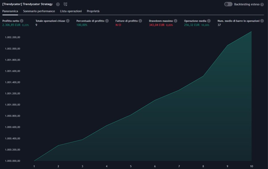 Di seguito il grafico della curva cumulata dei profitti (equity line) prodotta dal Trendycator; il risultato finale dell’investimento è decisamente meno volatile rispetto all’andamento complessivo dell’ETF.