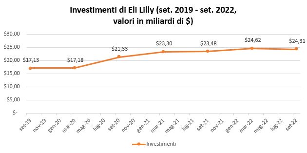 E la data non è casuale, in quanto è l’anno dello scoppio della pandemia. A ben vedere dunque, essendo Eli Lilly impegnata nel settore farmaceutico, si tratta di un aumento sugli investimenti in risposta a una situazione emergenziale per far fronte a una maggiore domanda di medicinali, tramite maggiori assunzioni, maggiori investimenti in ricerca e sviluppo (7 miliardi di dollari solamente nel 2021), e rafforzamento della supply chain.