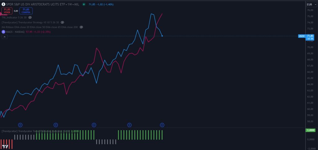 Sovrapponendo l’andamento dell’ETF USDV con il recente Roundhill Magnificent Seven (MAGS) si nota come le Magnifiche 7 non sono le uniche aziende a crescere nel tempo, anzi, una accurata diversificazione direzionandosi su aziende meno grandi potrebbe beneficiare al portafoglio.