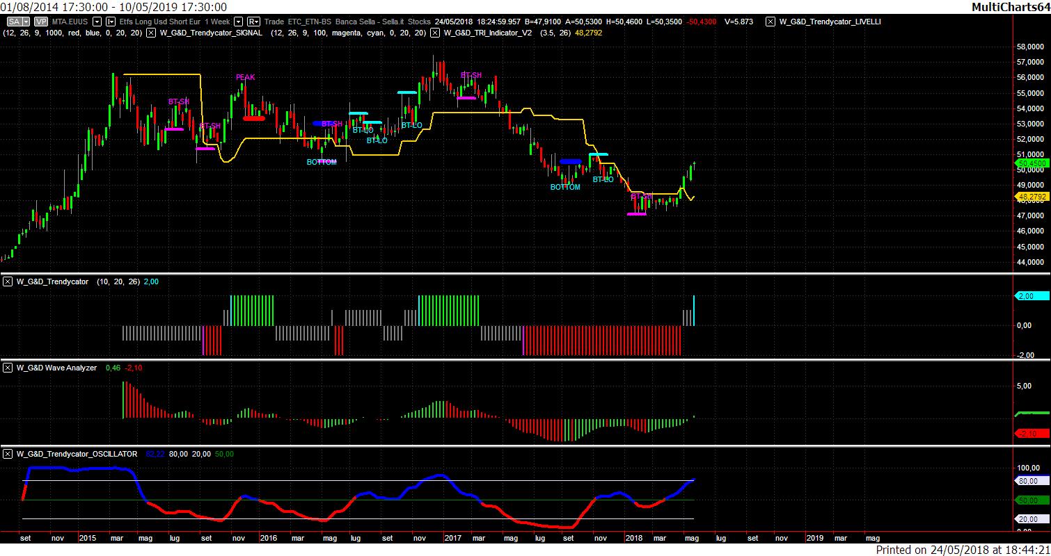Su tale ETN è in formazione un potenziale ingresso poiché Trendycator sta assumendo lo stato LONG (verde), cosa per altro compatibile con il movimento del cross valutario di queste ultime settimane, che lo ha visto passare da area 1,25 ad area 1,17.