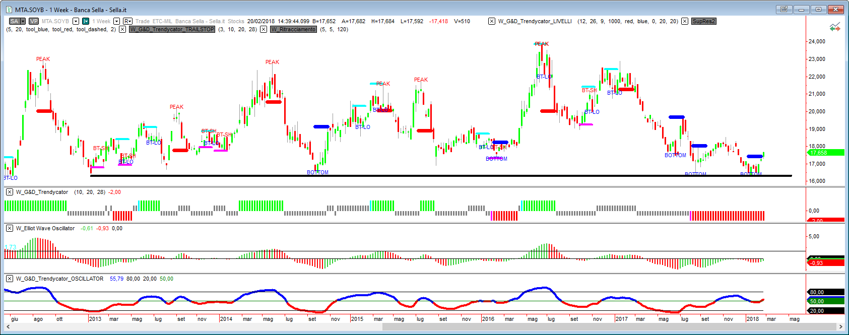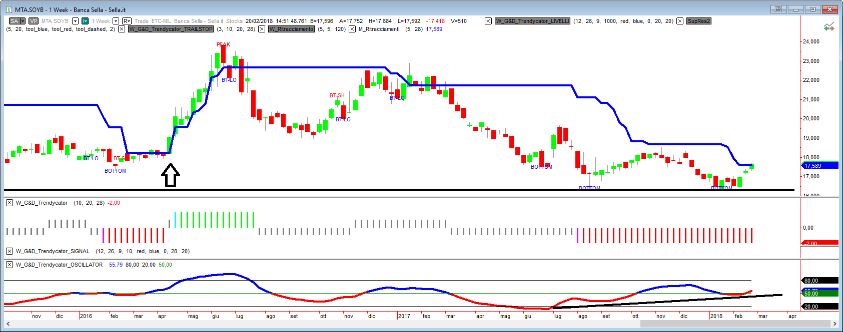 C’è però uno scoglio da superare che oggi limita l’operatività su questo strumento: ovvero il titolo si trova al test del TRI_Indicator (Trendycator Retrace Indicator). Un segnale di acquisto confermato si avrà solamente quando l’indicatore segnerà nuovi massimi come nell’esempio in immagine.