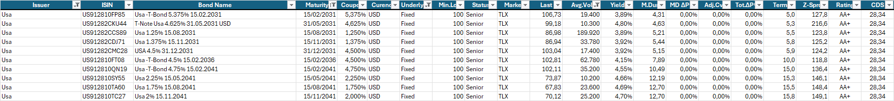 E a puro titolo di esempio, qui sotto un’estrazione di governativi in dollari con scadenze a 5, 10 e 15 anni, possibili candidati per chi ha un profilo di rischio adeguato e sa come gestire il rischio cambio nel caso di indebolimento del dollaro contro euro.