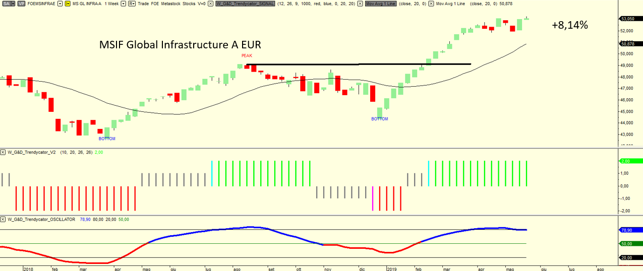 A riprova della sua natura anti-ciclica il fondo MSIF Global Infrastructure A EUR LU0384381660 sta continuando a registrare nuovi massimi, anche in queste settimane di fine maggio 2019 nelle quali le borse mondiali stanno nettamente segnando il passo.