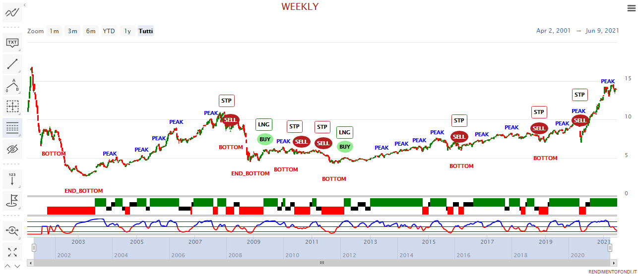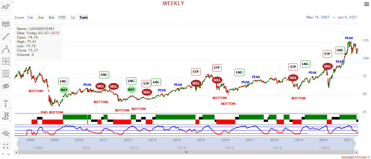 Ora che abbiamo studiato le caratteristiche principali di questo fondo, vediamo la sua performance storica e cosa ci dice il Trendycator a riguardo. Innanzitutto, notiamo subito come ha un buon valore ETI (18,9); inoltre, vediamo anche come abbia esordito piuttosto bene, per poi arrestarsi improvvisamente con la crisi finanziaria e recuperare lentamente dal 2009 in poi. Infine, nell’ultimo anno, complice anche la pandemia, il fondo ha preso il volo.