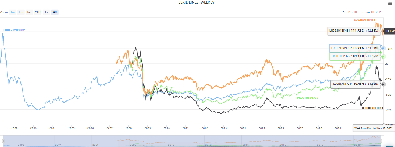 Veniamo ora al confronto finale: prendiamo i due ETF che vi avevamo presentato nell’articolo della scorsa settimana e li confrontiamo con i due fondi di questo articolo. Anche in questo caso, per prima cosa vediamo un confronto puramente grafico fra i quattro strumenti nell’immagine qui sotto: