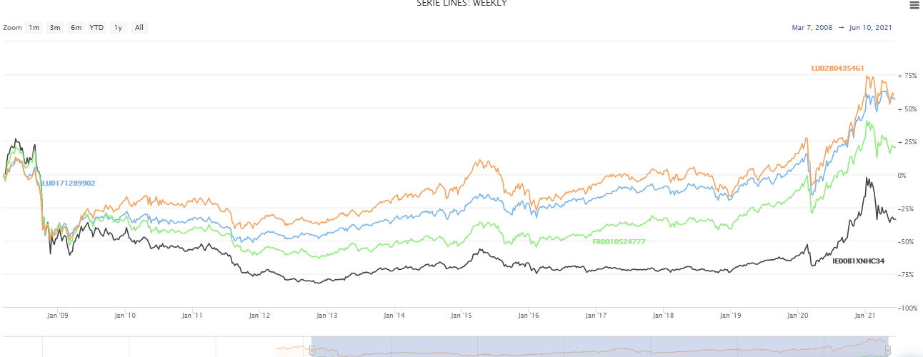 Per un confronto vero e proprio in termini di performance, però, per correttezza bisogna azzerare la performance di tutti i titoli alla data di partenza del titolo con minor storico, ovvero dal 17 marzo 2008. Il risultato può per versi sorprendere, perché i due fondi di investimento hanno avuto una performance di gran lunga superiore a quella dei due ETF: