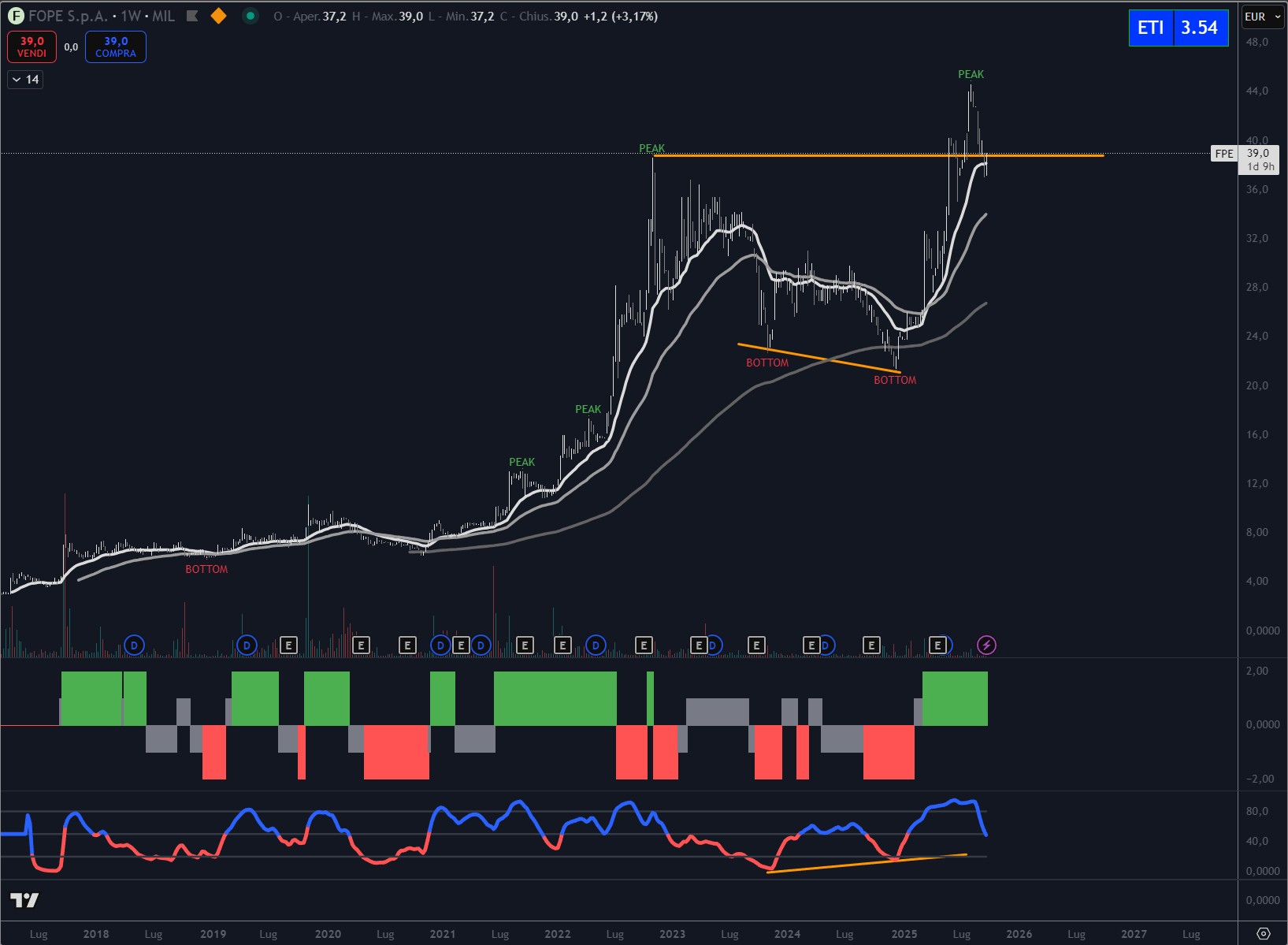 Analisi tecnica titolo Fope S.p.A. settembre 2025 Delphic Phenomenon in formazione sui massimi assoluti