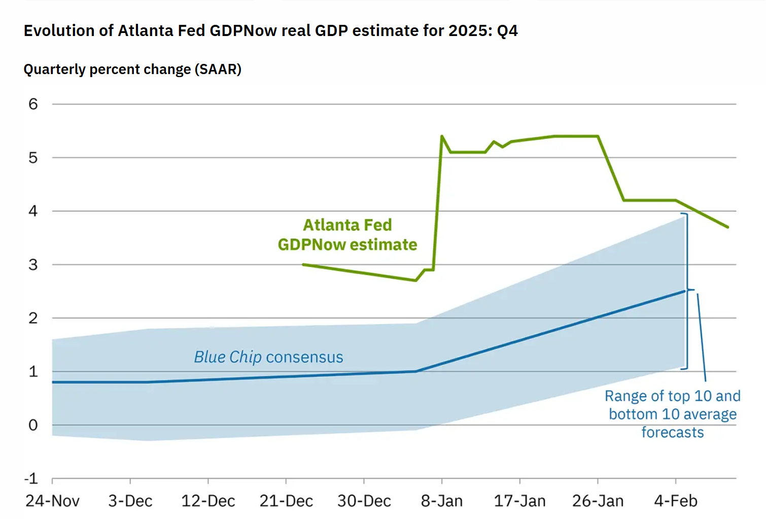 Il documento pubblicato il 10 febbraio 2026 riporta una stima di crescita del PIL reale per il Q4 2025 pari al 3,7% su base trimestrale annualizzata (SAAR).