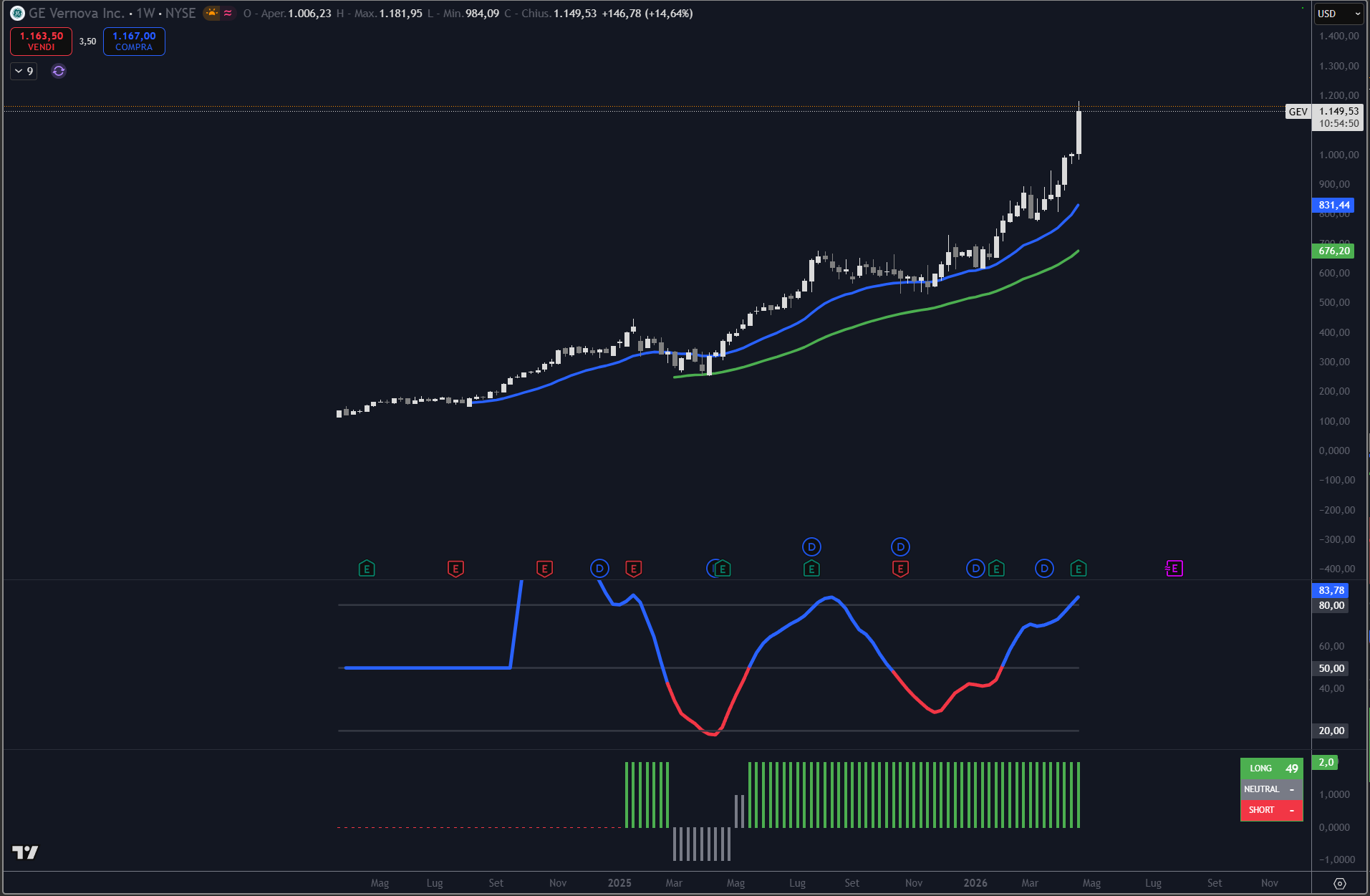 L’azione Vertiv è molto forte con un indice ETI di 16.77. A parte una piccola parentesi nel 2025 intercettata da Trendycator® ma che si è fermata sulla MM200, il titolo è sempre rimasto LONG di Trendycator e con un Oscillator che continua a indicare lo stato di forza.