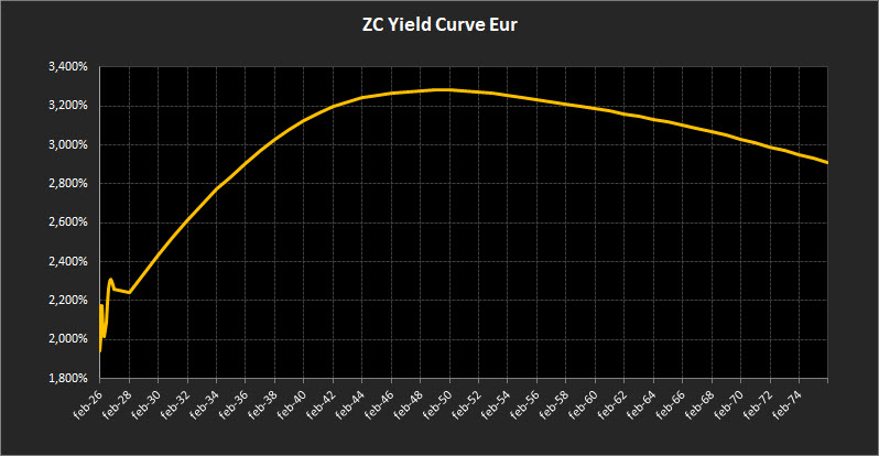 A partire dal 2048 la curva tende a distendersi, mantenendosi sostanzialmente piatta fino al 2052 con rendimenti in area 3,28%. Oltre tale orizzonte torna una progressiva inclinazione negativa sulle scadenze più lontane. Il rendimento a 50 anni si attesta al 2,91%, confermando come sul lunghissimo termine il mercato continui a incorporare attese di tassi e inflazione più contenute rispetto a quelle prezzate sulle scadenze intermedie, senza variazioni significative nello scenario di fondo.